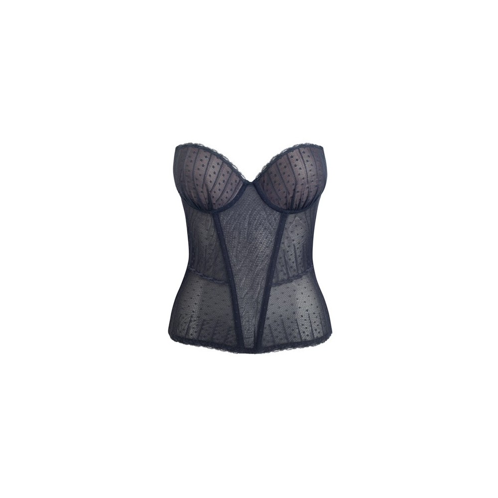 Bustier amb cúpula push-up i foam de color claret per fer realçar l'efecte plumetti. Cos totalment transparent però folrat amb tul per a més subjecció. Peça molt, molt sexy, especial per a dies especials. Tirants opcionals evolutius. Varetes per mantenir el bustier al seu lloc: 2 al centre davanter, 2 laterals, 2 a l'esquena Banda de silicona a l'esquena
