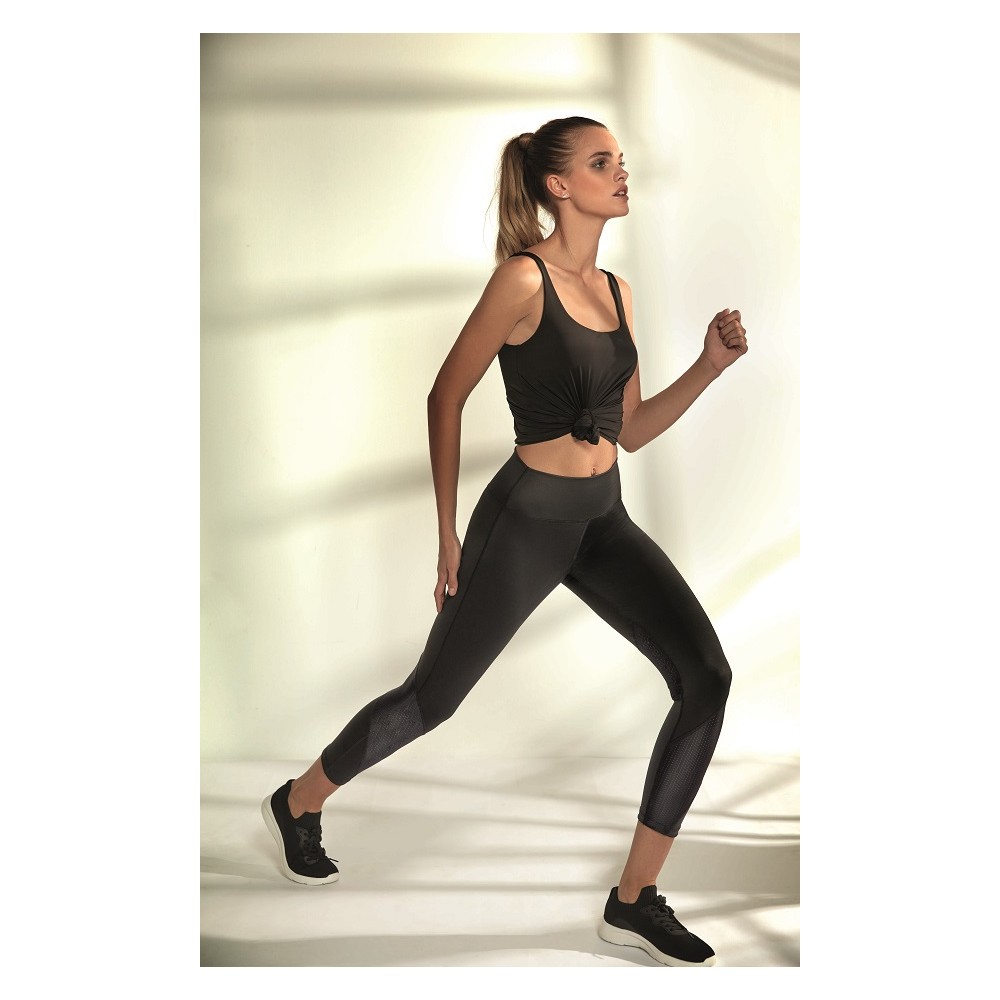 Es presenten còmodes tops, samarretes i variats leggings que tenen com a base un teixit tècnic, suau i d'elasticitat 3D, molt transpirable i totalment adaptable a la figura. Aquest teixit té a més la propietat d'exercir contenció i obtenir un efecte reafirmant del contorn dissimulant irregularitats de la pell com la cel·lulitis. Als legging la cintura ampla aporta una òptima subjecció abdominal.