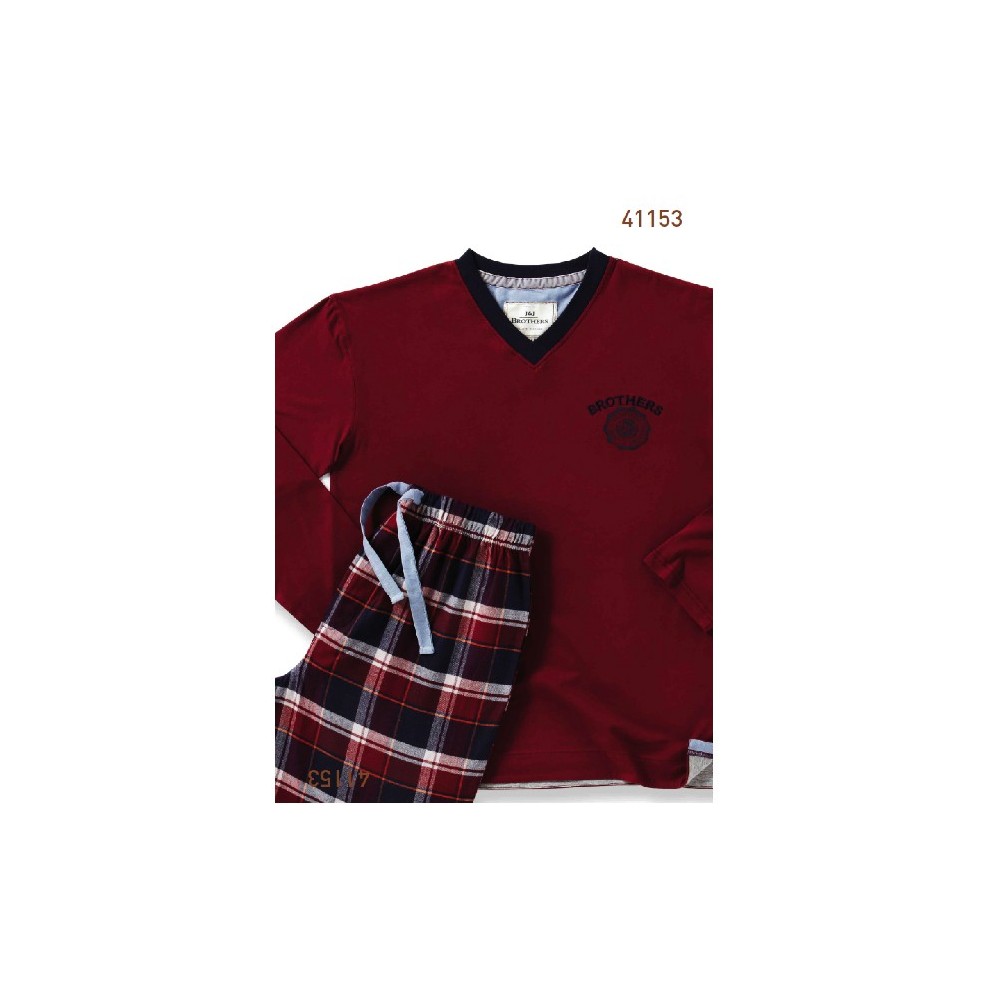 Pijama d'home de dues peces. Coll en punta i pantalons ajustable a la cintura amb goma i cinta.