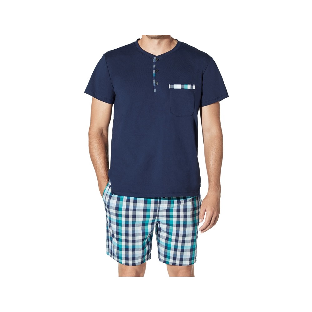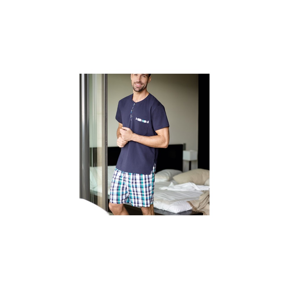 Pijama, con camiseta de algodón Supreme con tratamiento antipilling Cuello abierto mediante botones personalizados Short de algodón de plana elástica a conjunto con tapeta y bolsillo de la camiseta.