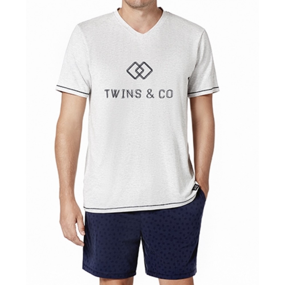 Pijama de algodón con un elegante estampado de geométrico bicolor en azul y blanco. Top de algodón con detalles del estampado en tapeta interior y tapeta bolsillo. Pantalón corto de algodón estampado con bolsillos.